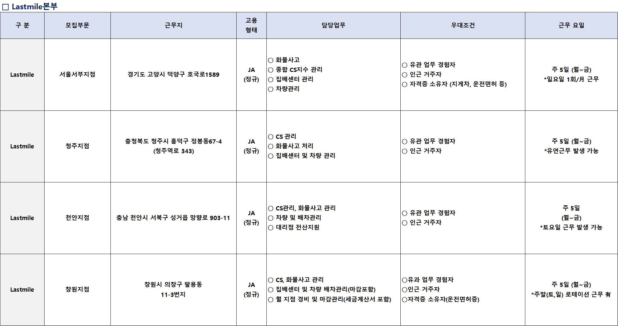 | 상세내용 | 롯데글로벌로지스 각 분야 신입(JA)채용 ■ 서류접수 기간 : '26.03.04(수) ~ '26.03.12(목) / 채용시 마감 ■ 우대 사항 • 장애/보훈 대상자 • 유관업무 경험자 ■ 근무 조건 ![]() ![]() ■ 고용 형태 : JA (정규직 신입) ■ 전형 절차 : 서류전형 > 인성검사 > 실무진면접 > 신체검사 > 최종합격 ■ 결과 발표 : 입사지원 페이지 확인 (각 전형 별 합격자에 한하여 유선연락 예정) ■ 기타 사항 • 입사지원사항 및 자격사항이 사실과 다를 경우 입사(합격)를 취소함. • 입사 후 배치 시, 직무와 지역은 회사 사정에 따라 협의 후 변경될 수 있음. • 입사 후 특수/이해관계로 인해 유착관계 등의 문제가 발생할 경우 내부 규정에 따름. • 채용문의 : 롯데글로벌로지스 HR팀 (kimdongmin@lotte.net) |