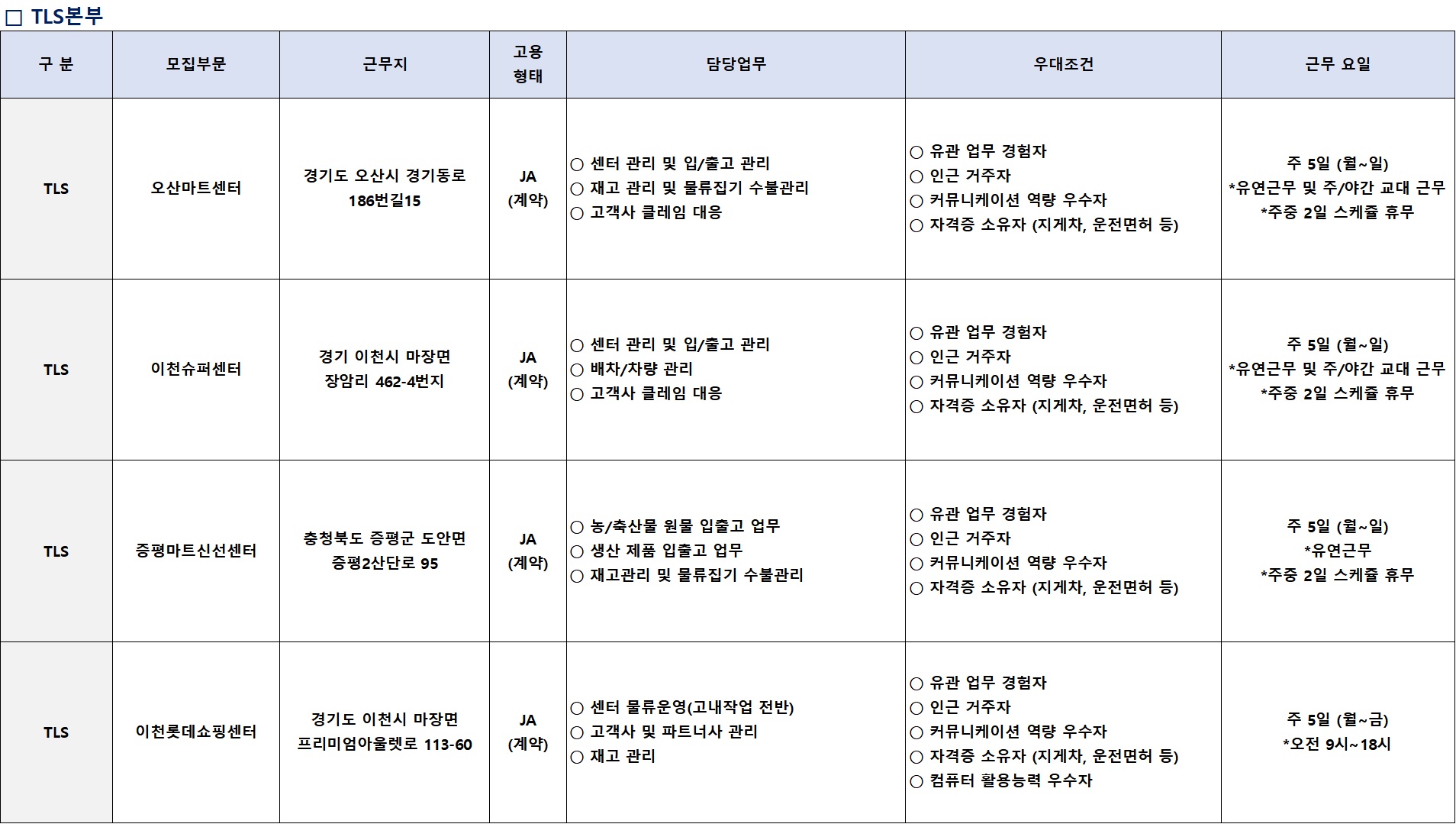 | 상세내용 | 롯데글로벌로지스 각 분야 계약직 채용 ■ 서류접수 기간 : '26.04.01(수) ~ '26.04.26(일) / 채용시 마감 ■ 우대 사항 • 장애/보훈 대상자 • 유관업무 경험자 ■ 근무 조건 ![]() ■ 고용 형태 : 계약직 *계약기간 : 1년(추후 협의를 통한 연장 가능) ■ 전형 절차 : 서류전형 > 인성검사 > 실무진면접 > 신체검사 > 최종합격 ■ 결과 발표 : 입사지원 페이지 확인 (각 전형 별 합격자에 한하여 유선연락 예정) ■ 기타 사항 • 입사지원사항 및 자격사항이 사실과 다를 경우 입사(합격)를 취소함. • 입사 후 배치 시, 직무와 지역은 회사 사정에 따라 협의 후 변경될 수 있음. • 채용문의 : 롯데글로벌로지스 HR팀 (kimdongmin@lotte.net) |