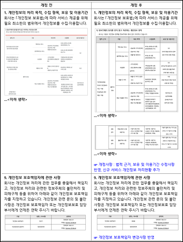- 개인정보 처리 및 보유 근거 수정사항 반영