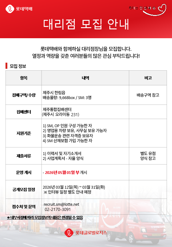 롯데는 진심배송! 항상 롯데택배를 사랑해주시는 여러분께 감사드립니다. 롯데택배 집배대리점 모집을 아래와 같이 공고하오니, 많은 관심과 지원 부탁드립니다. 지원서는 첨부된 파일을 다운로드하여 작성 후 이메일 접수처로 접수해주세요!